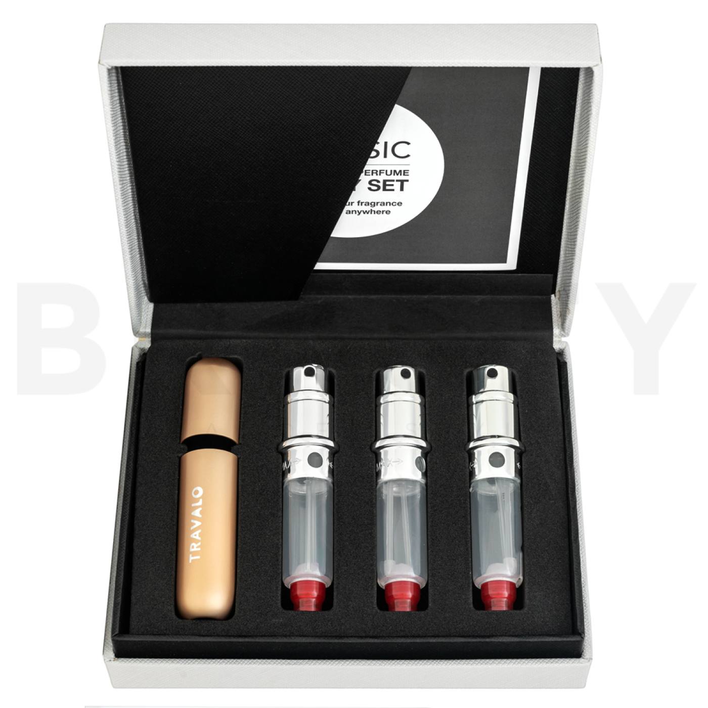 Sortimentul Travalo include în principal atomizoare portabile iconice pentru parfumuri, disponibile în diverse culori, designuri și volume – cel mai frecvent de 5 ml. Punctul forte al mărcii este colecția Travalo Classic, care a câștigat fani loiali datorită fiabilității și umplerii ușoare. Oferta se extinde și cu ediții limitate și colaborări speciale, care aduc noi tendințe și designuri originale. Travalo este alegerea ideală pentru toți cei care iubesc parfumurile și doresc să aibă nuanța preferată mereu cu ei – apreciată de călători, iubitori de arome și oricine preferă o îngrijire stilată și practică.